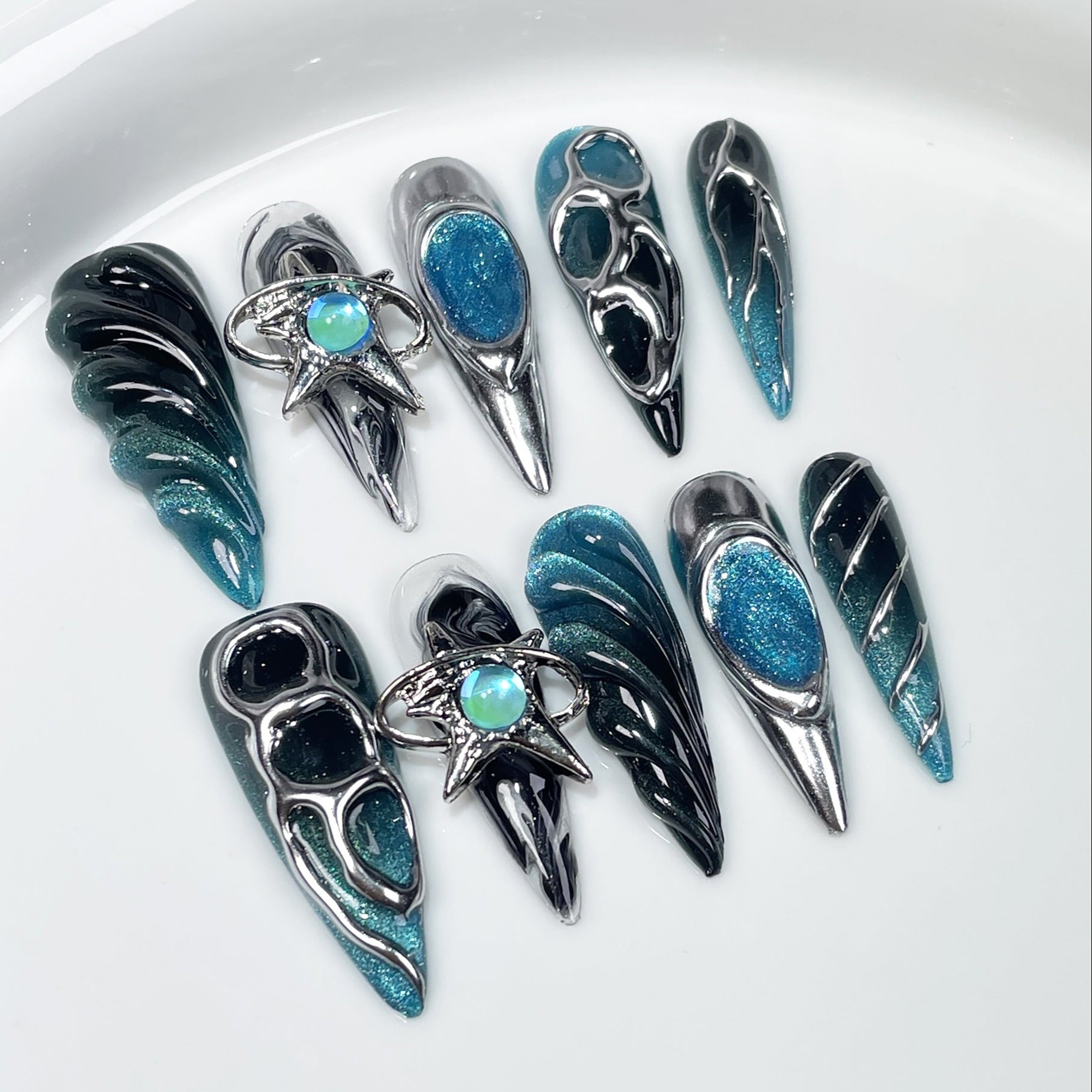 3D Metallic Long Stiletto | Handmade Nails