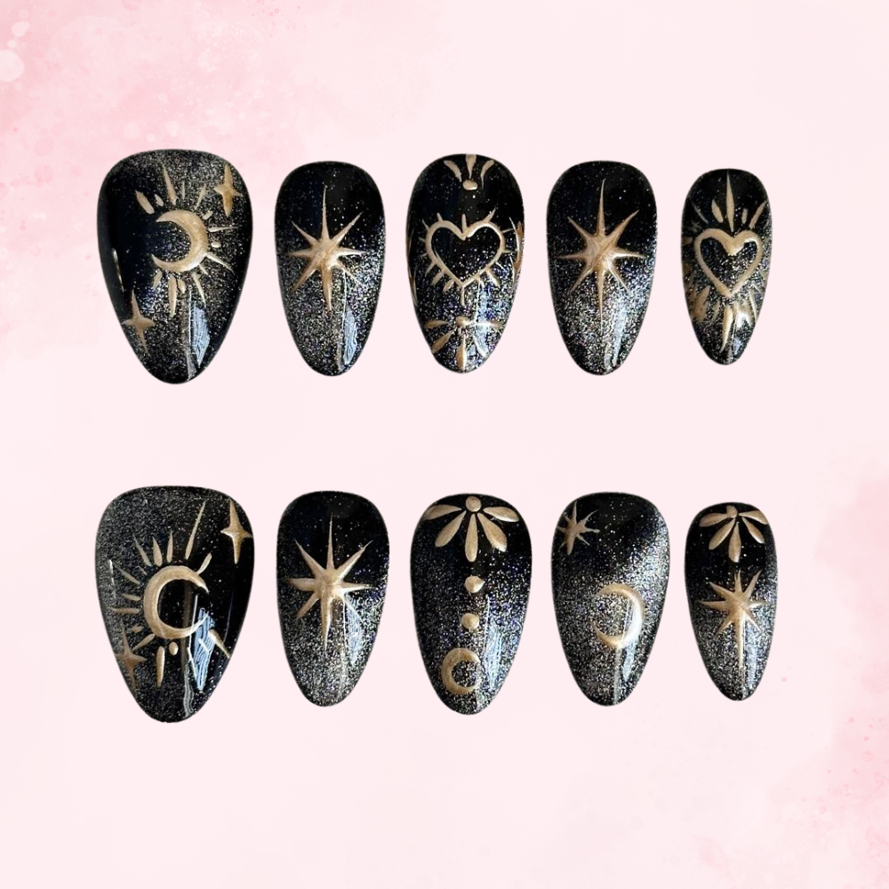 Each set has 10 pcs of Press-on nails and a Free application kit(Nail glue, Sticky tab, Nail file, and cuticle pusher). Within minutes- you'll have nails fit for a Queen!
