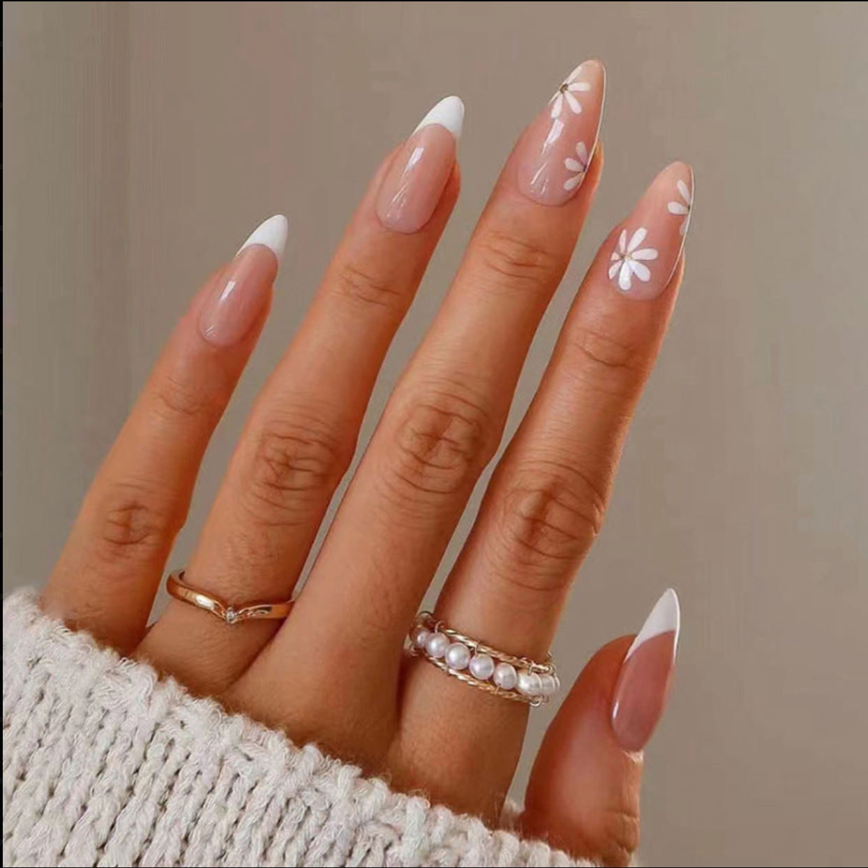 This soft nude manicure pairs classic white French tips with dainty floral accents for a look that’s effortlessly elegant. Featuring a smooth square shape and glossy finish, it’s your go-to for everyday beauty — fresh, feminine, and endlessly wearable. Whether you’re headed to brunch or simply embracing your soft side, these nails add a floral touch of grace to any moment. 🤍