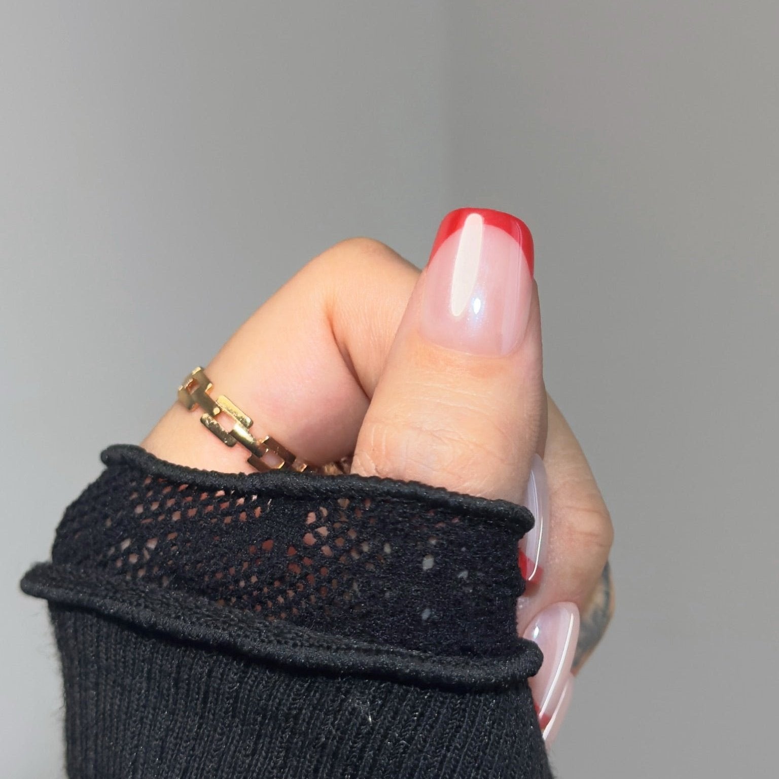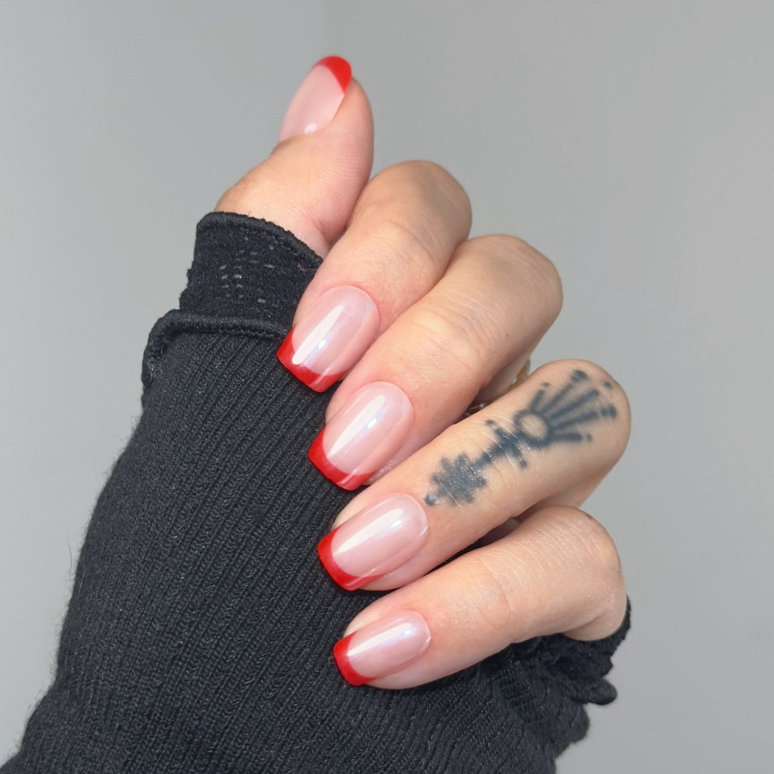 Bold and sophisticated! ❤️✨ Short square nails with a glossy nude base, topped with rich red French tips for a confident, modern twist on a classic look. Perfect for making a statement!
