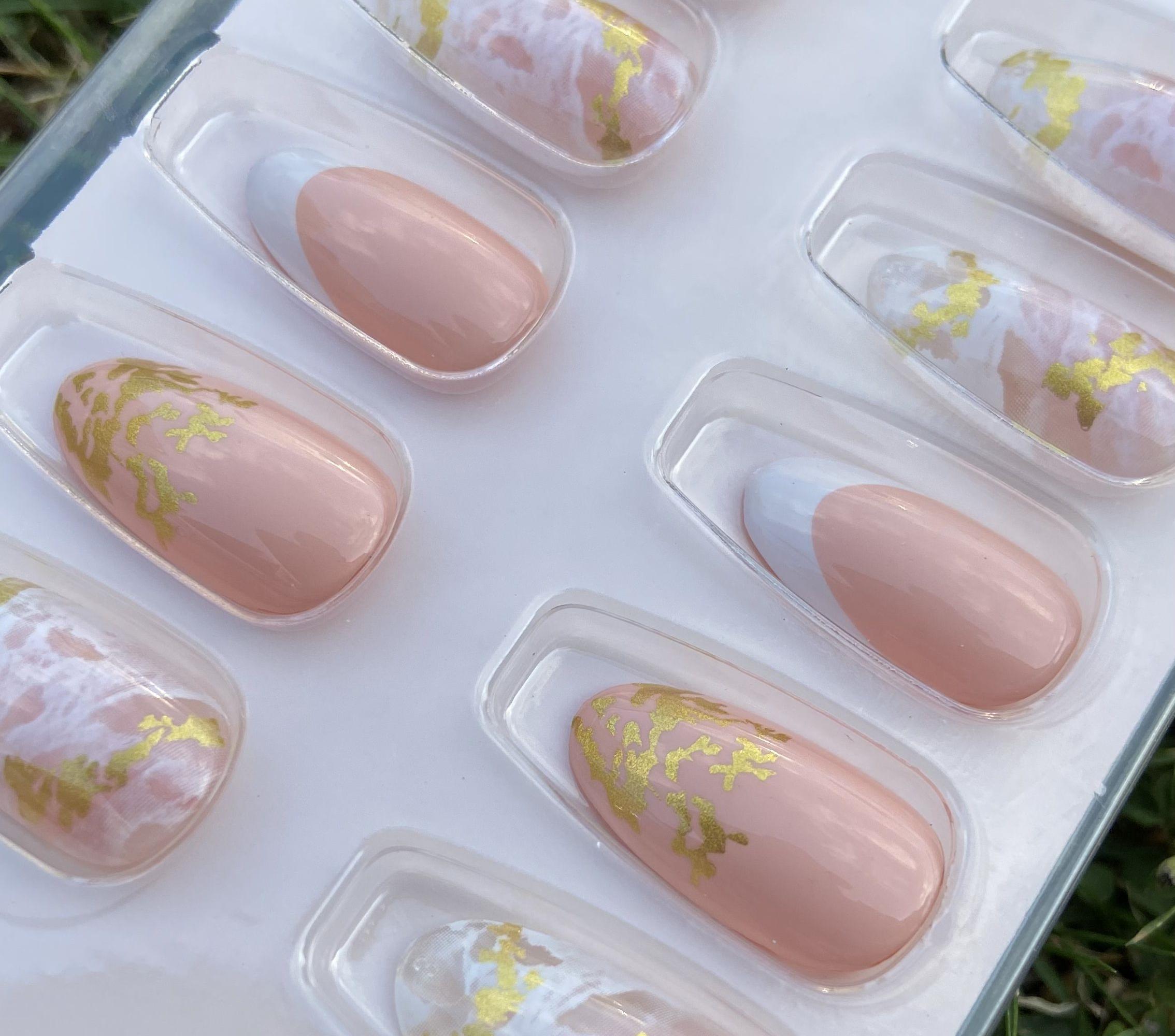 Elevate your style with these elegant and artistic nails! 🌸✨ Featuring a soft nude base paired with intricate marble effects in pink and white, this design is topped with delicate gold foil accents that bring an extra touch of luxury. The combination of abstract textures and metallic details creates a refined, artistic look perfect for any special occasion or whenever you want to feel a bit glamorous. Embrace the subtle elegance and sophisticated charm at your fingertips.