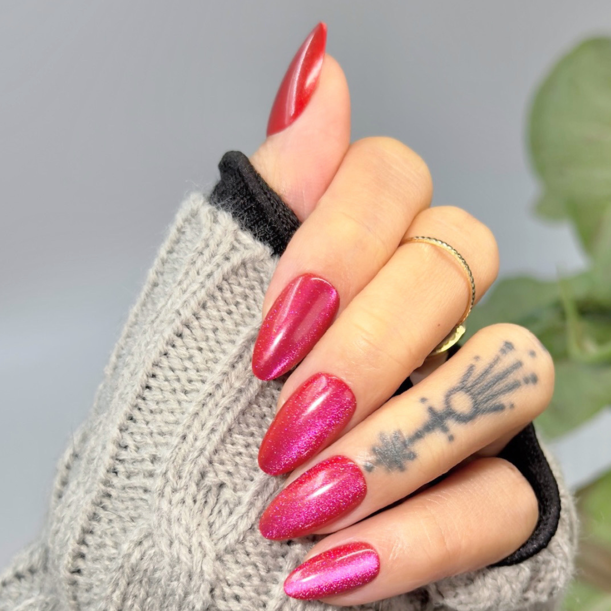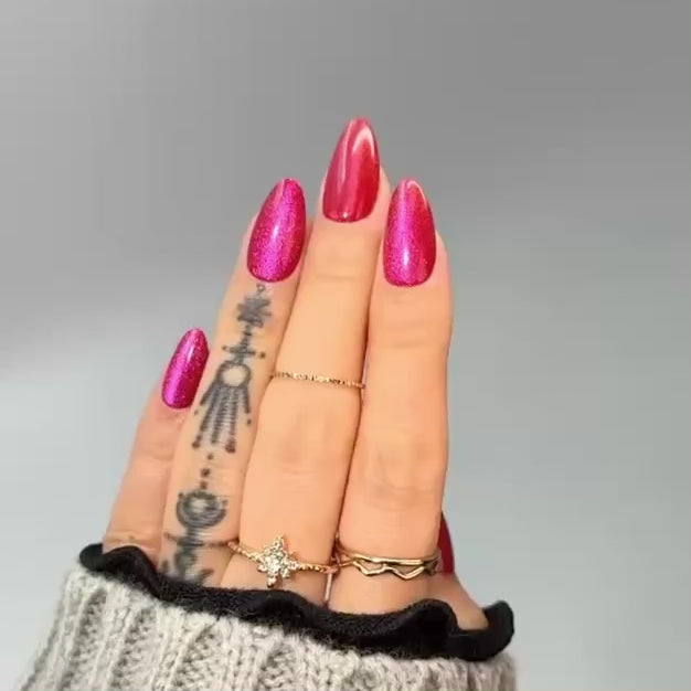 Sparkle and shine with these dazzling, ruby-red almond nails! 💅✨ Perfectly shaped and infused with glitter, they radiate glamour with every movement. Whether you're dressing up for a night out or adding a touch of elegance to your day, these press-ons are your ultimate accessory!