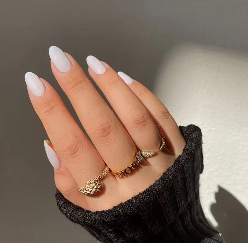 The crisp white polish paired with an elegant almond shape gives off a clean, sophisticated look that never goes out of style. Perfect for any occasion, from everyday wear to special events, these glossy white nails add a touch of modern elegance to your outfit.
