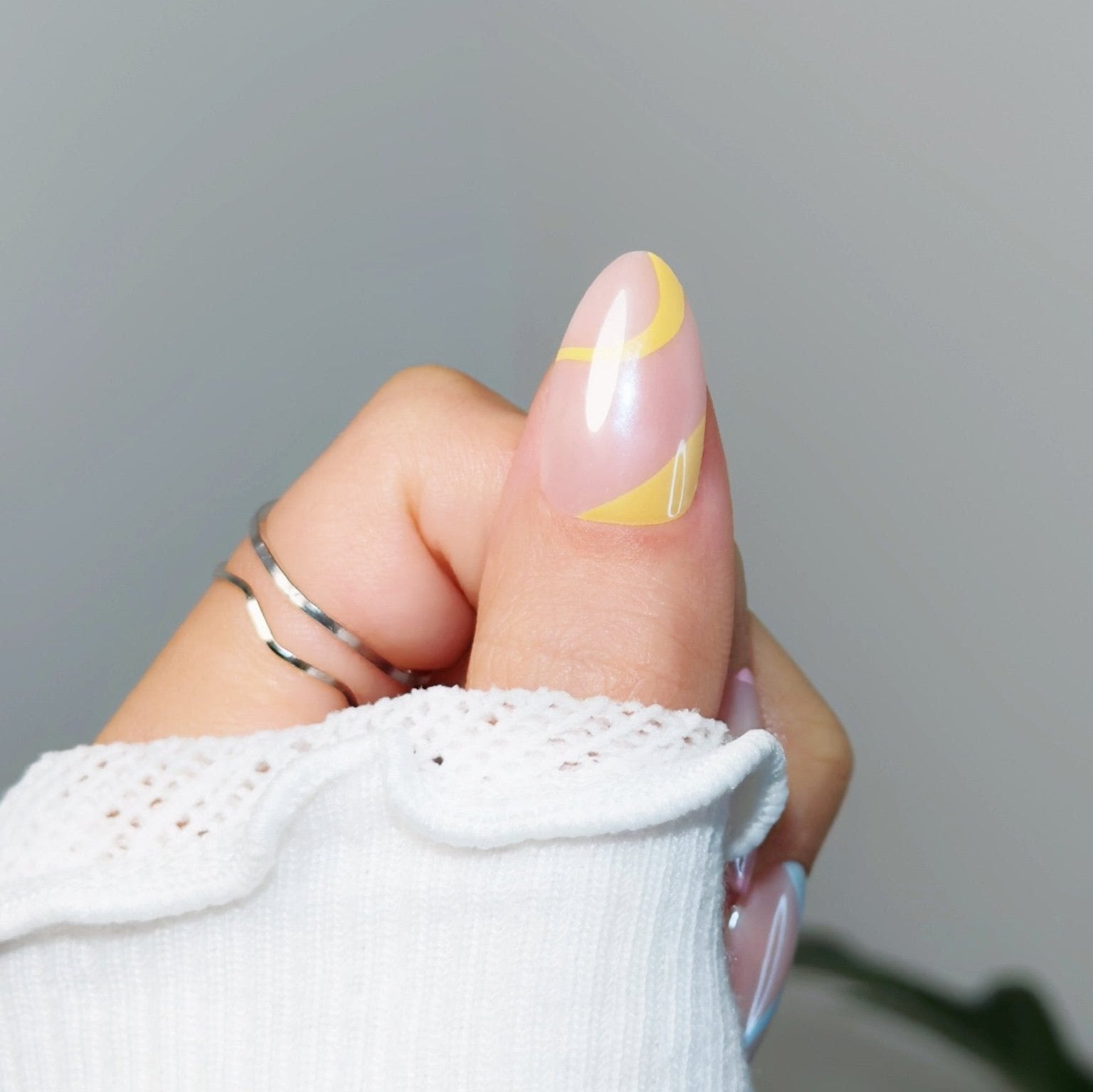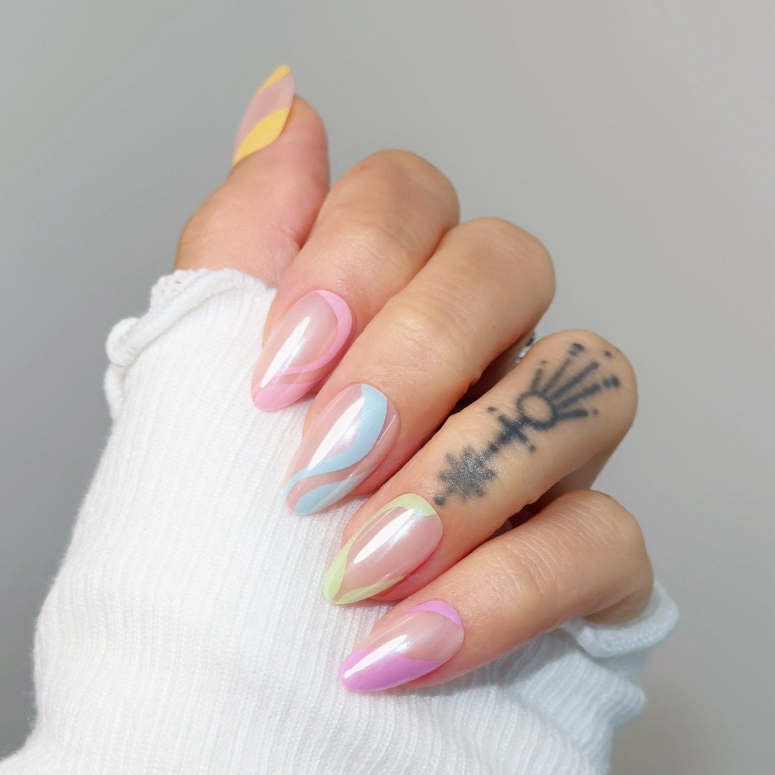 Say hello to these dreamy color splash nails! Featuring a soft nude base with swirls of pastel pink, blue, green, and yellow, these glossy almond-shaped nails are the perfect blend of fun and elegance.✨ Ideal for a playful, colorful look that brightens any day!