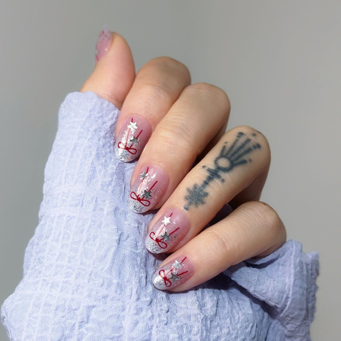 Festive sparkle meets elegance! 🎀✨ Short, chic nails with shimmering silver tips, playful red ribbon accents, and magical star details—perfect for a holiday-ready look! 💅