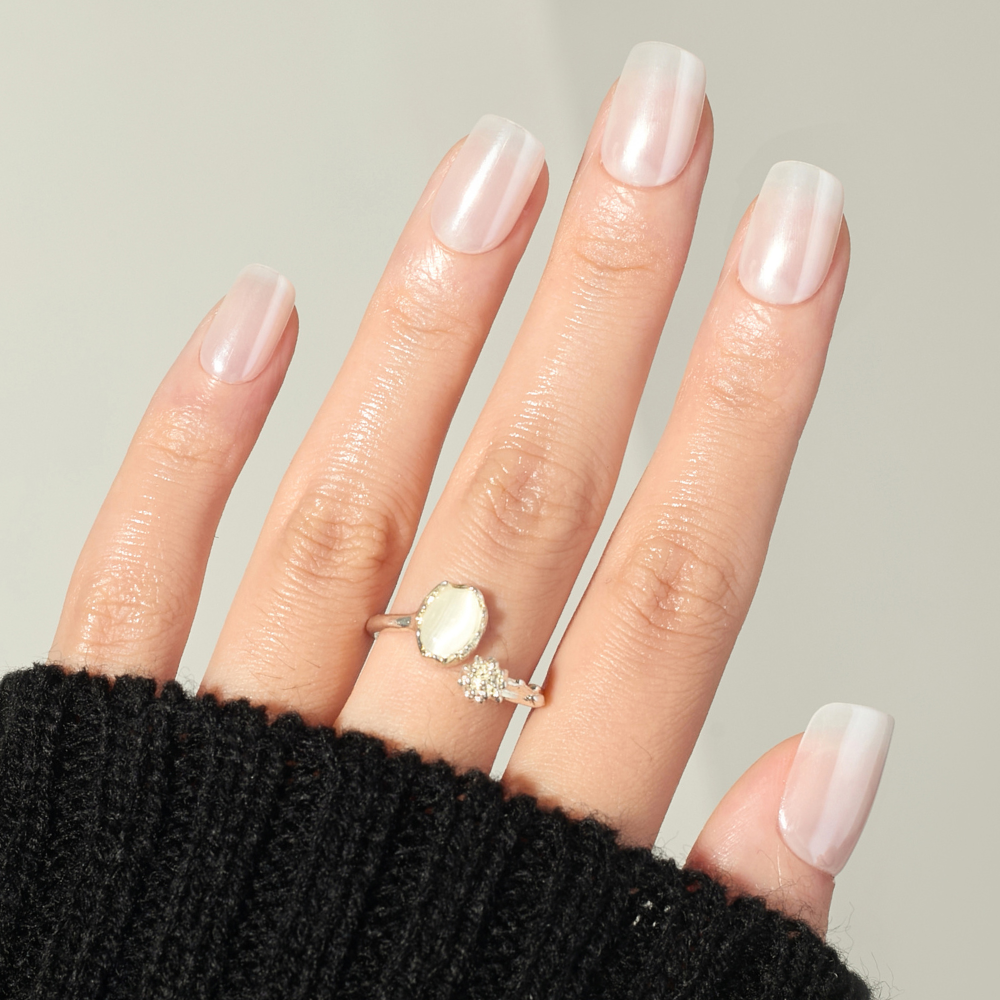 - Press the Press-on Nail onto the sticky tad, starting from the cuticle and working towards the tip.
