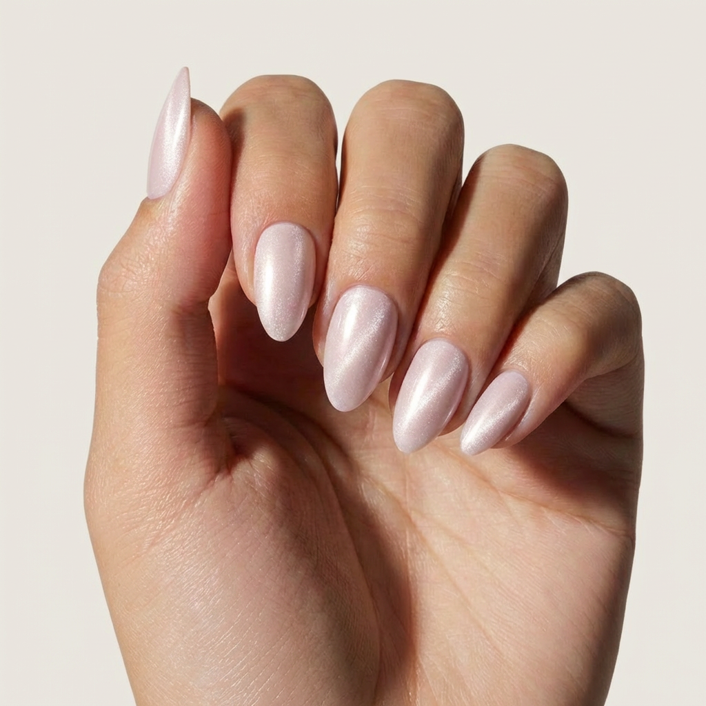Meet “Pearl Frost Pink” ❄️ These short almond nails shimmer with a soft, milky pearl pink finish, accented by a subtle, diffused cat-eye sparkle that catches the light like fresh frost. The design is simple yet luxe, offering a fresh and refined beauty that blends calm serenity with a whisper of understated glamour ✨